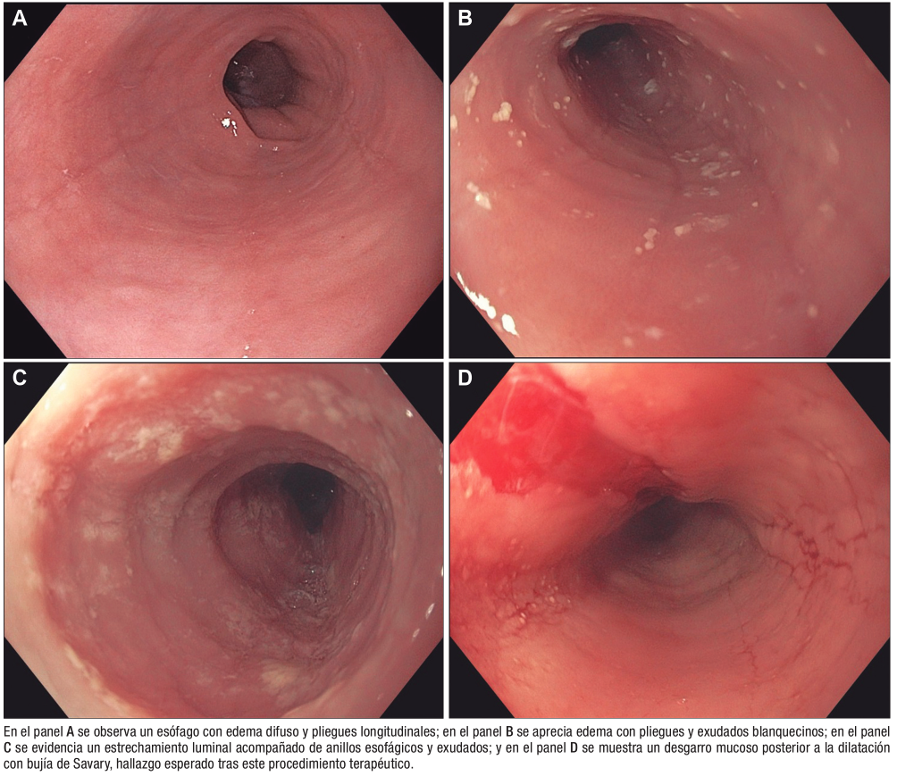 Las manifestaciones clínicas de la EEo varían con la edad; los pacientes pediátricos a menudo presentan dificultades para alimentarse, retraso del crecimiento, reflujo y dolor abdominal, mientras que los adolescentes y los adultos frecuentemente presentan disfagia e impactación alimentaria.11-13 Aunque la presentación típica en el adulto es la disfagia, a veces con historia de impactación alimentaria y en algunos casos con pirosis o dolor torácico, es importante recalcar la importancia de obtener una detallada historia clínica, ya que los pacientes pueden adoptar medidas compensatorias y comportamientos de evitación o modificación de alimentos, en algunos casos negando o minimizando la presencia de disfagia, lo que puede ocasionar retrasos en el diagnóstico. Las adaptaciones conductuales pueden incluir acompañar los bocados de alimentos con tragos de líquidos, para suavizar la consistencia, cortar los alimentos en fragmentos pequeños o realizar purés, comer lentamente y ser el último en levantarse de la mesa, evitar carnes, panes crujientes o alimentos con consistencias espesas, y masticar excesivamente para facilitar la deglución.14, 15