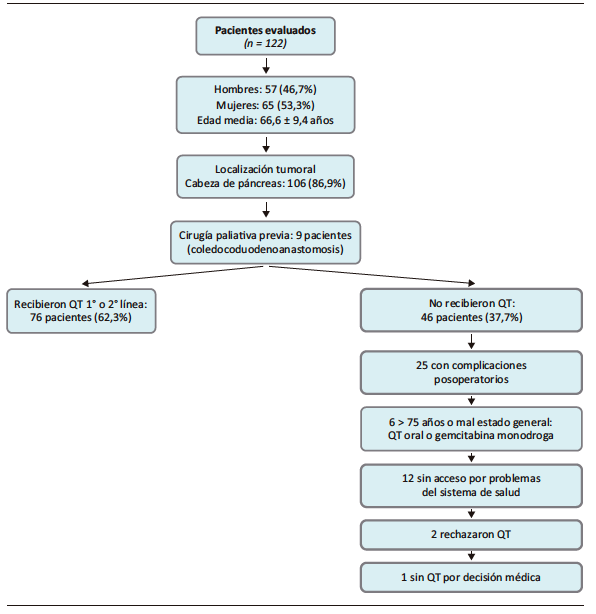 Se analizaron 122 casos. Correspondieron 57 a hombres (46,7%) y 65 a mujeres (53,3%), presentando una edad media de 66,6 años (DE ± 9.4). El sitio más frecuente de localización tumoral fue la cabeza del páncreas, presentándose en 106 casos (86,9%). Nueve pacientes (derivados de otros centros) tenían una cirugía paliativa previa (coledocoduodenoanastomosis) y fueron resecados por nuestro grupo. Recibieron tratamiento con quimioterapia de primera y segunda línea 76 pacientes (62,3%). Las causas que impidieron realizar tratamiento quimioterápico de primera o segunda línea a los 46 pacientes restantes fueron las siguientes: 25 presentaron complicaciones que demoraron la posibilidad de iniciar tratamiento; 6 tenían una edad superior a 75 años o un estado funcional que solo les permitió recibir quimioterapia vía oral (capecitabine) o gemcitabine monodroga; 12 no pudieron acceder al tratamiento debido a las dificultades del sistema público; 2 rechazaron la quimioterapia, y uno no recibió tratamiento por decisión del oncólogo tratante. (Ver flujograma a continuación).
