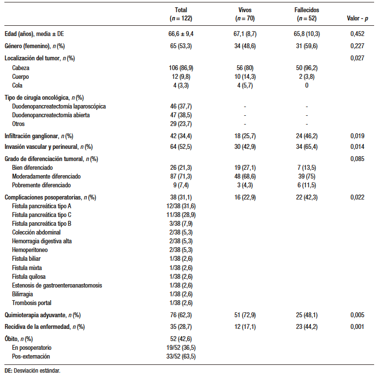 Introducción. El adenocarcinoma ductal de páncreas es una de las neoplasias malignas más letales, con una supervivencia a cinco años inferior al 10%. La mayoría de los pacientes se diagnostican en estadios avanzados, y se prevé un aumento en su incidencia y mortalidad en la próxima década. Objetivos. Estimar la supervivencia global de pacientes operados con diagnóstico de adenocarcinoma ductal de páncreas y analizar los factores clínico-patológicos asociados. Materiales y metodos. Estudio observacional, de cohorte retrospectiva y multicéntrico. Se incluyeron pacientes operados entre enero de 2019 y diciembre de 2024, con diagnóstico histológico de adenocarcinoma ductal de páncreas. Se establecieron factores en relación con la supervivencia global mediante análisis multivariado (regresión de Cox). Resultados. Fueron evaluados 122 pacientes. La media de edad fue de