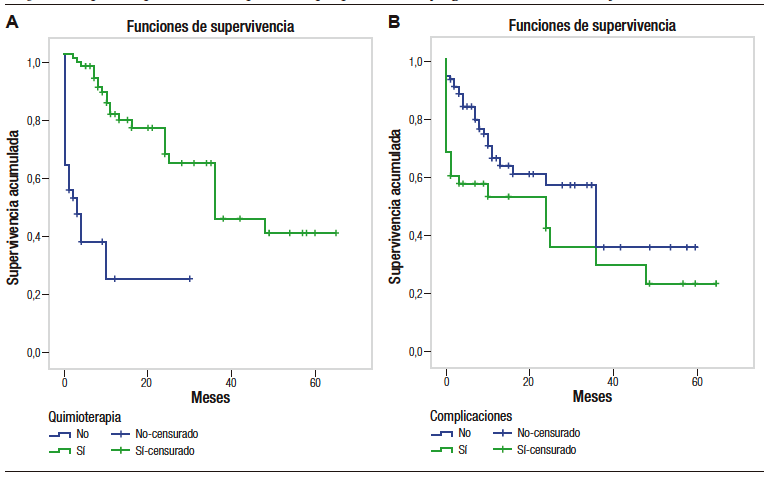 Estadística inferencial. Para la comparación de grupos se utilizó para variables cuantitativas el test de T de Student; para comparación de variables categóricas se utilizó el test de Chi cuadrado o el test Exacto de Fisher. Para la estimación de la supervivencia global se calculó el tiempo en meses transcurrido desde la realización de la cirugía oncológica y el fallecimiento (evento). Mediante curva de Kaplan-Meier se ilustró la supervivencia para los subgrupos planteados: indicación de quimioterapia adyuvante, complicaciones posoperatorias y presentación de recidiva. Los intervalos de confianza para la supervivencia se calcularon mediante el método de Greenwood. Los tiempos de supervivencia se compararon mediante el test de Mantel-Cox (Log-Rank). Se realizó análisis multivariado de Cox. El modelo convergió correctamente y el método para empates utilizado fue Breslow. Se estimaron los Hazard Ratio (HR) y sus intervalos de confianza.