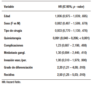 En el análisis multivariado, la quimioterapia fue el factor más protector. El HR de 0,09 indica una reducción de aproximadamente 91% en el riesgo de fallecer, ajustando por las demás variables. Recidiva de enfermedad y grado de diferenciación tumoral se asociaron con un mayor riesgo de muerte. Los factores como edad, sexo, tipo de cirugía, metástasis ganglionares, invasión vascular y complicaciones posoperatorias no mostraron significación estadística en este modelo multivariado, aunque podrían ser clínicamente relevantes en otros contextos (Tabla 2).