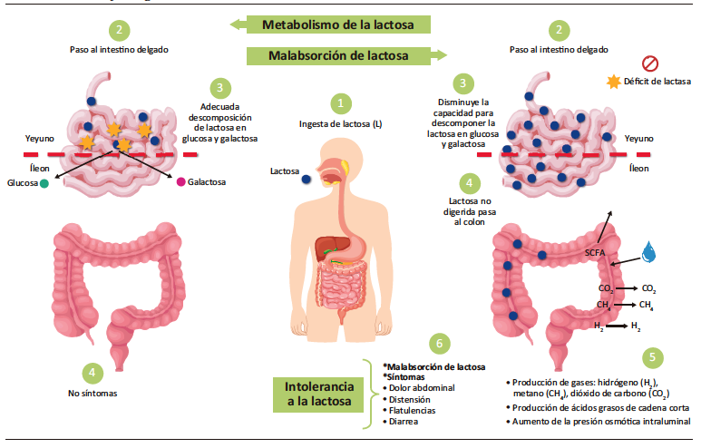 Figura 2. Eventos fisiológicos durante el metabolismo de la lactosa, malabsorción e intolerancia a la lactosa