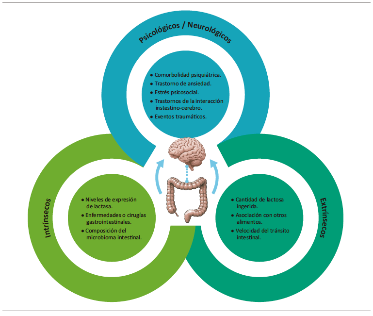 La causa de los síntomas asociados con la ingestión de lactosa es multifactorial,8 como se resume en la Figura 5. Existen factores extrínsecos que contribuyen al desarrollo de síntomas, como la cantidad de lactosa ingerida, el consumo de lácteos junto con otros alimentos que modifican el tránsito intestinal y, en consecuencia, la velocidad de llegada de la lactosa al colon. Entre los factores intrínsecos se incluyen la expresión de lactasa en el borde en cepillo, antecedentes de trastornos gastrointestinales o cirugías abdominales, y la composición de la microbiota intestinal. Asimismo, se han identificado factores inherentes al paciente que modulan el desarrollo e intensidad de los síntomas relacionados con el consumo de lactosa, como la presencia de trastornos de ansiedad, niveles elevados de estrés psicosocial y trastornos de la interacción cerebro-intestino (TICI), como el SII.19 Algunas publicaciones utilizan el término “intolerancia a la lactosa funcional” para describir la aparición de síntomas tras el consumo de lactosa sin evidencia de malabsorción en las pruebas diagnósticas. Además, deben considerarse factores individuales en la aparición de síntomas extraintestinales en los pacientes que refieren intolerancia a la lactosa. En un estudio con 1422 pacientes con TICI, a quienes se les realizaron pruebas para detectar malabsorción de lactosa, los síntomas extraintestinales más frecuentes fueron fatiga (67%), problemas de concentración (35%), depresión (28%), artralgias (26%) y mialgias (24%). Se observó una correlación positiva entre el número de síntomas intestinales y extraintestinales (r = 0,35; p < 0,001). Sin embargo, la coexistencia de MA fue inversamente proporcional a la cantidad de síntomas referidos, lo que sugiere que los síntomas gastrointestinales posteriores a la ingesta de lactosa se asocian con distensión mecánica, mientras que los síntomas extraintestinales podrían estar relacionados con la estimulación química por productos de fermentación, metabolitos de la microbiota intestinal y somatización.20