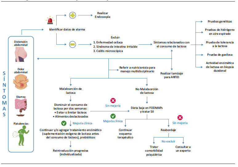 Se estima que el 70% de los adultos que experimentan dolor y distensión abdominal, meteorismo y/o diarrea refieren como desencadenante o factor exacerbante el consumo de alimentos como los lácteos y/o ciertos carbohidratos. De esta población, el 89% ya ha realizado restricciones dietéticas antes de acudir a una valoración médica, principalmente mediante una dieta sin lactosa o baja en oligosacáridos, disacáridos, monosacáridos y polioles fermentables (FODMAPs), sin considerar que el consumo de lácteos puede ofrecer beneficios para la salud y la microbiota en cualquier etapa de la vida.1 Por lo tanto, la restricción injustificada de lácteos podría tener consecuencias negativas en la calidad de vida y en el estado nutricional de los pacientes. A pesar de que la primera descripción de casos de intolerancia a la lactosa (IL) data del año 400 a. C, la entidad clínica comenzó a reconocerse en los últimos cincuenta años.2 La prevalencia aproximada de la IL es del 57% a nivel global, del 50% en Sudamérica, y del 53% en la población mexicano-estadounidense.3 En México, la causa más común es la deficiencia primaria de lactasa (DPL), que se estima que ocurre en el 30% de los mexicanos adultos.4 El síndrome clínico más común de malabsorción de carbohidratos es el relacionado con la lactosa. Sus características clínicas son inespecíficas, se asemejan y/o pueden superponerse con otros trastornos funcionales digestivos y/o enteropatías, e incluyen meteorismo, distensión abdominal y diarrea osmótica.5 La malabsorción de lactosa (MA) y la IL son dos entidades clínicas distintas que con frecuencia se confunden, son pobremente abordadas por el inusual uso de métodos diagnósticos como la prueba de medición de Hidrógeno en aire espirado (HAE) o prueba de aliento con lactosa y, por ello, están sobre diagnosticadas. Otro factor, otro factor que dificulta el abordaje diagnóstico es la falta de un método estándar de oro, la disponibilidad limitada de los métodos actuales en la mayoría de los centros de atención clínica y el costo de estos. En pacientes en quienes se confirma la presencia de MA e IL, el manejo debe ser multidisciplinario y el pilar del tratamiento debe ser la modificación dietética que promueva la resolución de los síntomas, sin incrementar el riesgo de desnutrición ni el desarrollo del trastorno por evitación o restricción de la ingesta alimentaria (ARFID, por su sigla en inglés).