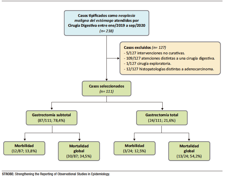 El período de reclutamiento de casos estuvo comprendido entre enero de 2019 y septiembre de 2021, con un seguimiento de los casos no menor a tres meses (extendiéndose el período de estudio hasta diciembre de 2021). Este trabajo comprendió dos cohortes de estudio: gastrectomía subtotal y total. Su diseño de adhirió a las recomendaciones respecto del “Fortalecimiento de la comunicación de estudios observacionales en Epidemiología” (STrengthening the Reporting of OBservational studies in Epidemiology, STROBE).11