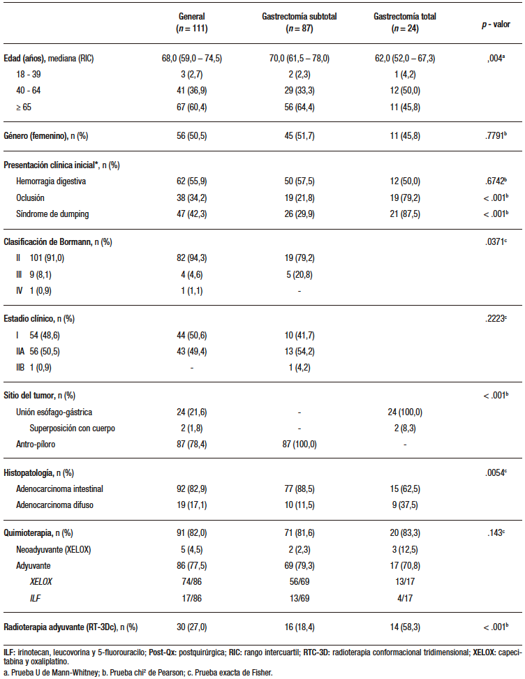 Durante el período de reclutamiento, un total de 111 pacientes fueron incluidos. Todas las cirugías fueron abiertas. De estos, 20/111 (18%) requirieron intervención de urgencia. En 87 pacientes (78%) se realizó una gastrectomía subtotal y en 24 pacientes (22%) una gastrectomía total (Figura 1). La mediana de edad de la muestra fue de 68 (59 – 74,5) años, y 56/111 (50,5%) fueron de género femenino. En comparación con el grupo de gastrectomía subtotal, los pacientes en quienes se practicó gastrectomía total fueron significativamente más jóvenes (mediana de edad de 70 vs. 62 años, p = .004), con una presentación clínica inicial más severa (oclusión 21,8% vs. 79,2%, p < .001; dumping 29,9% vs. 87,5%, p < 0,001), e histopatología más agresiva (adenocarcinoma difuso 11,5% vs. 37,5%; p < 0,0054). (Tabla 1)