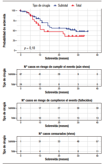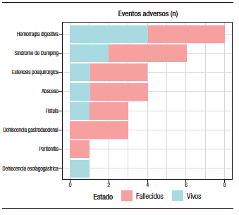 La mediana de seguimiento poscirugía de los casos estudiados fue de nueve meses. Ningún caso tuvo un seguimiento menor a tres meses. En general, la tasa de mortalidad a treinta, noventa días poscirugía, mortalidad global y sobrevida global fue de 1/111 (0,9%), 3/111 (2,7%), 43/111 (38,7%) y 9 (RIC 5,5 – 25,0) meses, respectivamente. En específico, la tasa de mortalidad a treinta, noventa días poscirugía, mortalidad global y sobrevida global entre los intervenidos mediante gastrectomía subtotal fue de 1/87 (1,1%; IC 95% 0,1 – 6,9), 2/87 (2,3%; IC 95% 0,1 – 8,6), 30/87 (34,5%; IC 95% 25,3 – 44,9) y 8 (5 – 25,5) meses; mientras que, mediante gastrectomía total, 0/24 (p = 1), 1/24 (4,2%; IC 95% 0,1 – 22,1; p = 0,5221), 13/24 (54,2%; IC 95% 35,1 – 72,0; p = 0,1296) y 9,5 (6 – 23,5, P = .2) meses, respectivamente. No existió diferencia estadísticamente significativa entre la mortalidad o sobrevida global, independientemente de su definición (HR 1,542; IC 95% 0,803 – 2,956; p = 2) (Figura 2). En la Figura 3 se detallan los eventos adversos entre los pacientes vivos vs. los fallecidos.