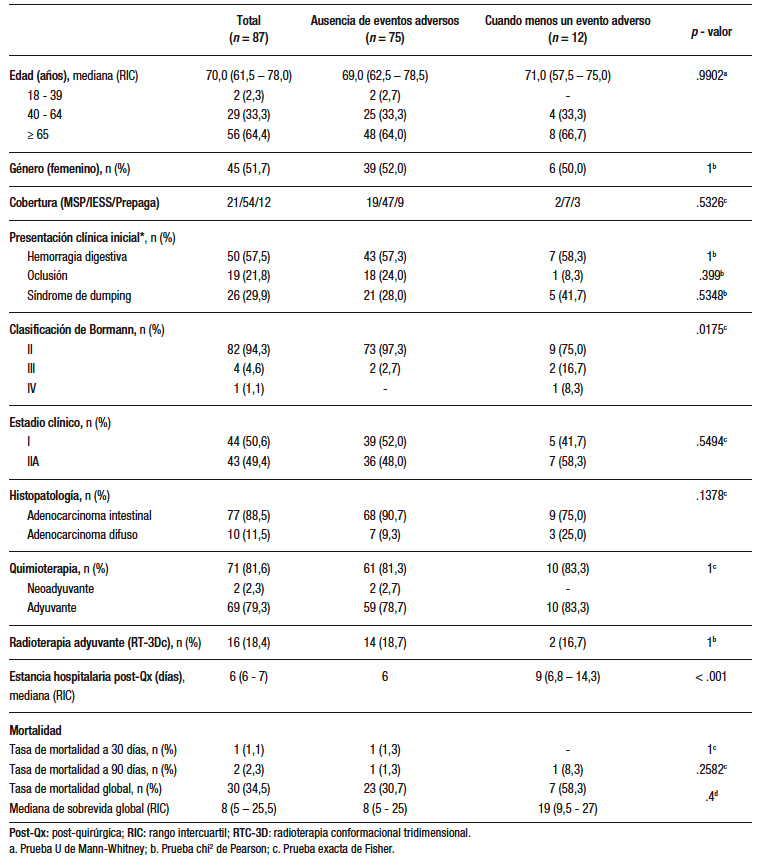 Definición de los desenlaces oncológicos. La morbilidad fue definida como la presencia de al menos algún evento adverso relacionado con la gastrectomía efectuada, durante los quince días posteriores a su realización. Se trató de una variable discreta polinomial mutuamente no excluyente. Se anticipó cuando menos los siguientes eventos adversos: absceso, dehiscencia de sutura esofagogástrica o gastro-duodenal, estenosis posquirúrgica, fístula, hemorragia digestiva, peritonitis y síndrome de Dumping. Adicionalmente, a la definición de morbilidad se agregó la estancia hospitalaria poscirugía. Se calcularon las tasas de mortalidad a los treinta días, a los noventa días y de forma global. La tasa de mortalidad global se definió como la proporción de pacientes que fallecieron durante el período del estudio, comprendido desde la fecha de la primera gastrectomía con intención curativa (enero de 2019) hasta los noventa días posteriores a la cirugía del último paciente incluido (diciembre de 2020). La sobrevida global se definió como el período comprendido entre la fecha de la gastrectomía y la última consulta, teleconsulta o fallecimiento del paciente.