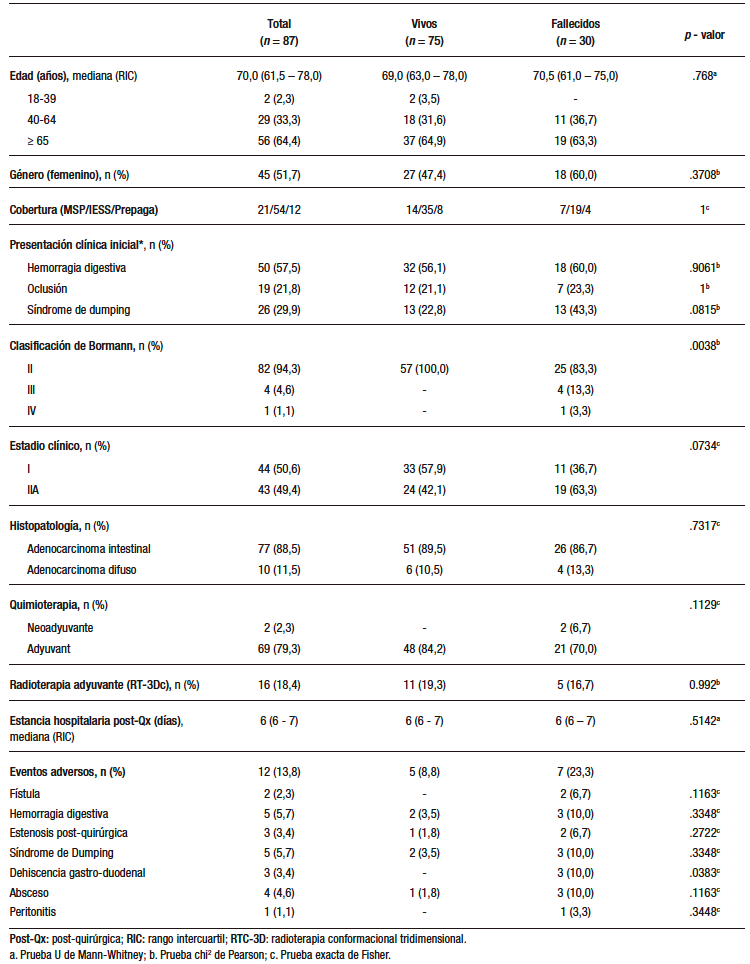 Recuperación de la información. Toda la información concerniente a las variables y desenlaces oncológicos previamente descriptos fue ingresada en una hoja electrónica encriptada y en línea compatible con Microsoft Access. En caso de que algún paciente no haya continuado el seguimiento posquirúrgico en el ION-SOLCA, ya sea por decisión propia o por haber sido referido únicamente para la gastrectomía (recibiendo atención oncológica integral en otra institución), se realizó una teleconsulta para recuperar la información correspondiente. Finalmente, se consultó al Registro Hospitalario del ION-SOLCA y a la Dirección General de Registro Civil, Identificación y Cedulación del Estado ecuatoriano respecto de las fechas precisas de fallecimiento en los casos requeridos.