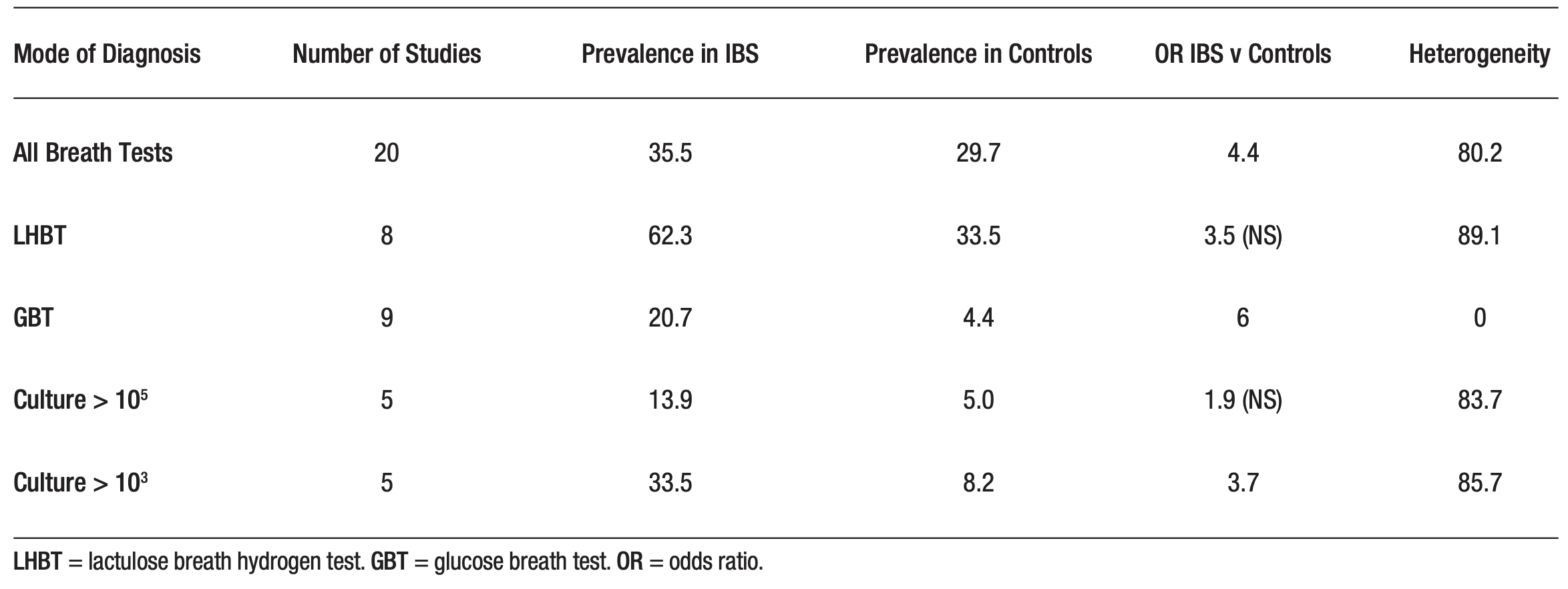 At least two meta-analyses have examined the outcomes of diagnostic tests for SIBO among subjects with IBS. Both found that SIBO prevalence in IBS is highly dependent on test modality, with the highest rates being noted with a lactulose breath test and the lowest with aspirates that define SIBO at a threshold of 103.16, 17 In the meta-analysis performed by Shah and colleagues, heterogeneity was extremely high for all tests, with the exception of the glucose breath test. This undoubtedly contributed to their finding that SIBO prevalence was no different from that in the control group when using the LBHT or aspirates and cultures interpreted based on a cut-off of threshold of 105.17 (Table 1).