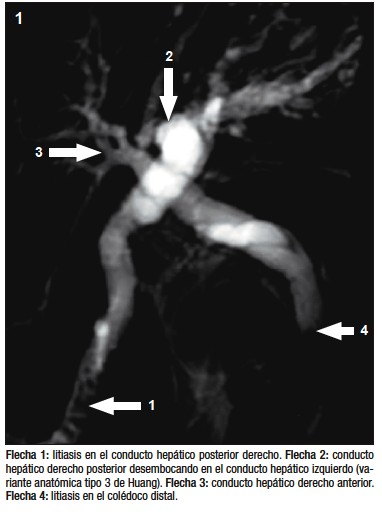 El estudio por colangioresonancia evidenció una variante anatómica biliar tipo 3 de la clasificación de Huang, ya que el conducto hepático posterior derecho drenaba en el conducto hepático izquierdo.1 Se observaron imágenes compatibles con litiasis intrahepática derecha y litiasis en el colédoco distal. La CPRE confirmó la presencia de la variante anatómica del patrón ductal hepático derecho y permitió realizar una canulación selectiva con posterior extracción de litos mediante balón y canastilla.2 El paciente tuvo una buena evolución clínica sin complicaciones.